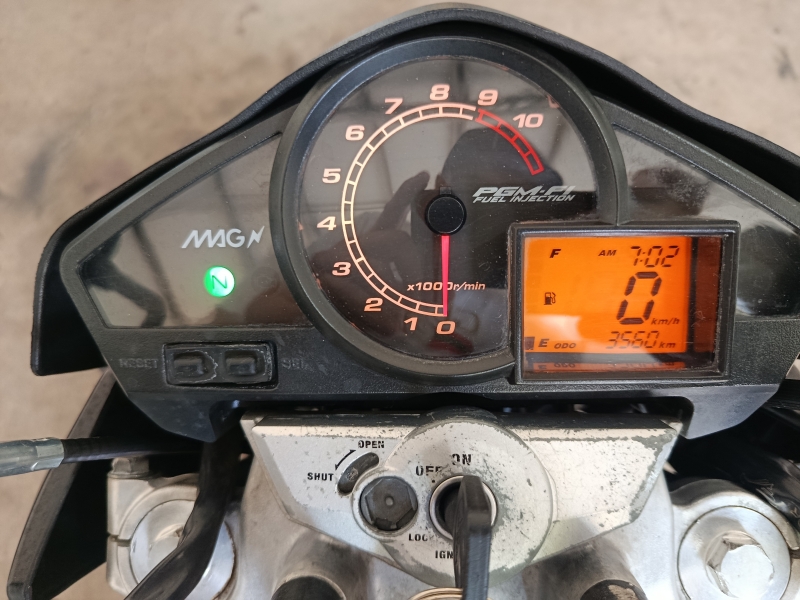 moto completa, partida elétrica, freio a disco na dianteira e rodas de liga leve.